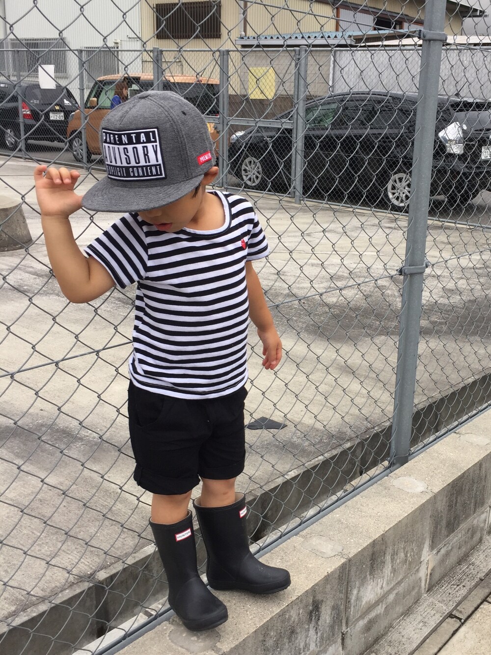 ブラック系のレインシューズを着用したキッズの夏コーディネートの1枚目の写真