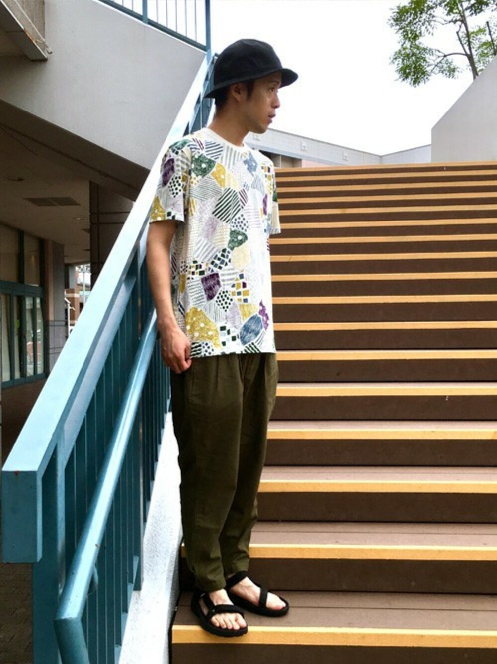 空から見たイギリスの田園風景を描いた総柄Tシャツです。 ハットにスポーツサンダルと夏らしく、シンプルな感じに。暑い夏をグラニフのTシャツを着て楽しみましょう!