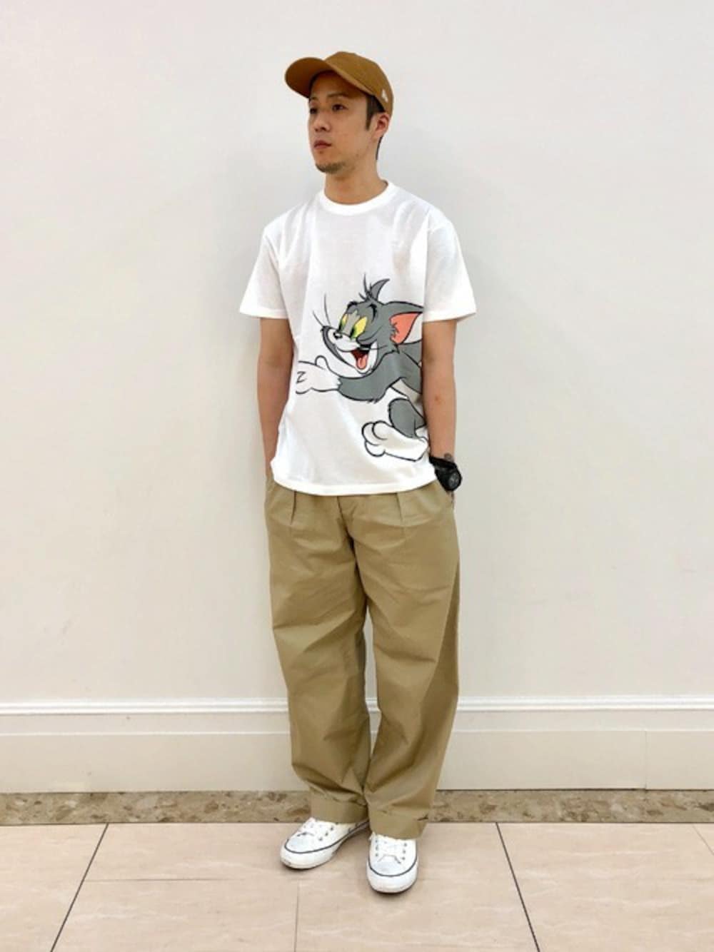カートゥーンの定番『トムとジェリー』。追いかけっこしているトムとジェリーの姿を前後にプリントして、動きを表現したデザインです。 懐かしさを感じますね。 ゆったりコーデで、ブラウンのキャップはジェリーを意識しています!