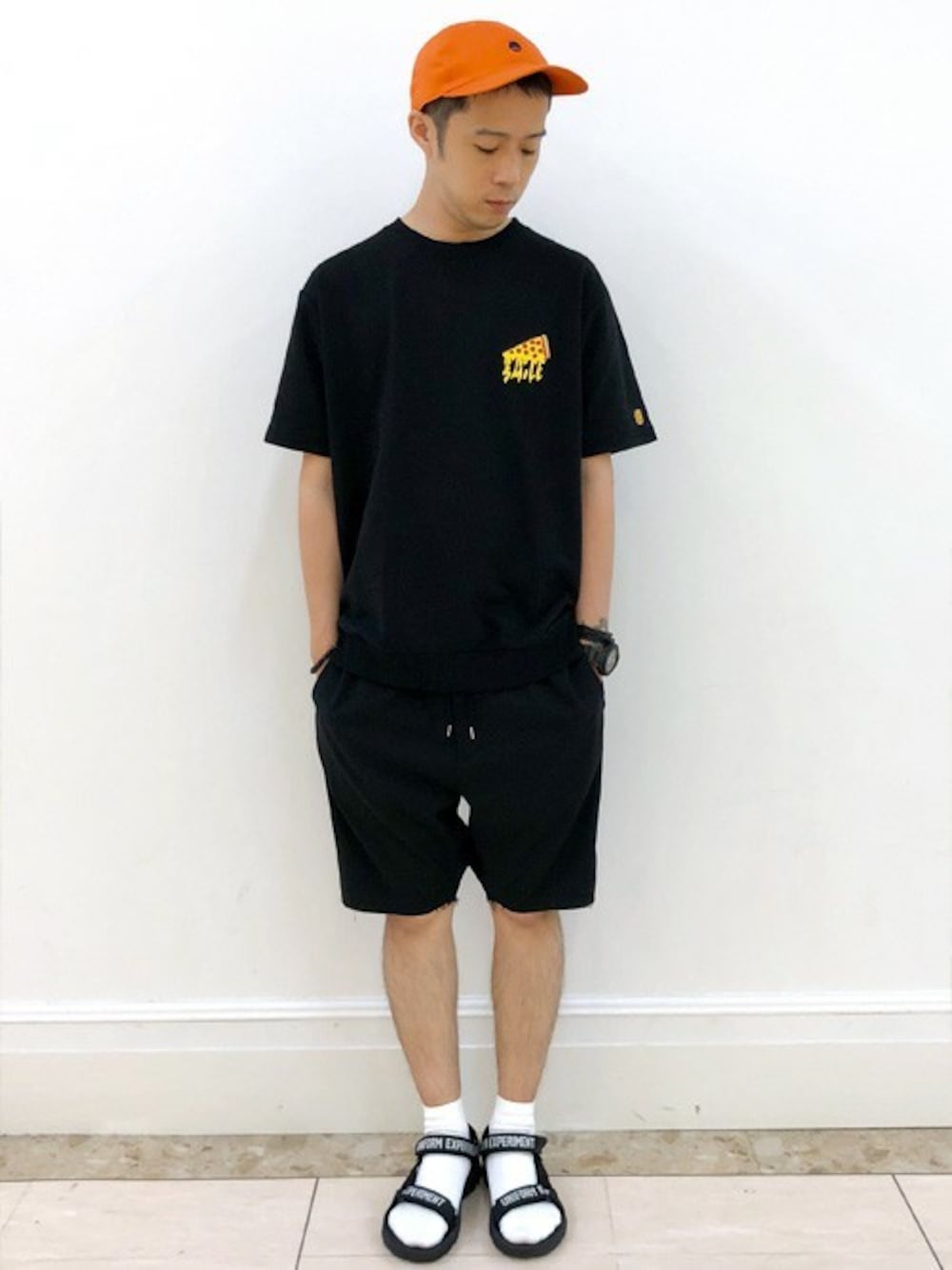 美味しそうなピッツァの刺繍が入ったシンプルな半袖スウェットT。 ブラックコーデに挑戦したくなるアイテムですね!今回はオレンジを差し色に。