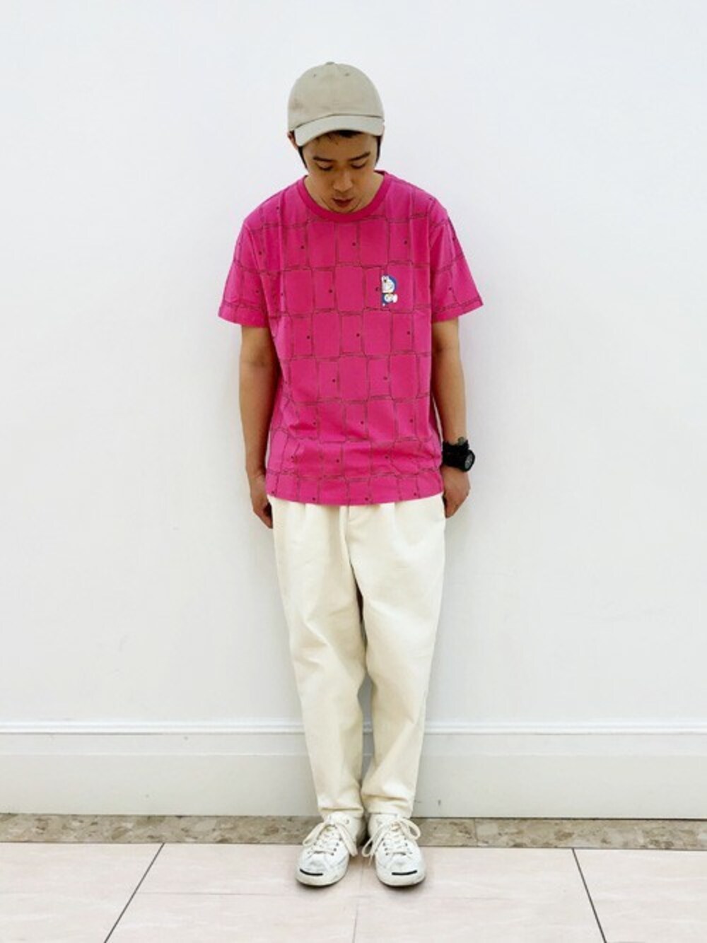 おなじみの「どこでもドア」の総柄Tシャツ。ひとつのドアからドラえもんがのぞいてます。ポップなピンクTシャツはホワイトコーデで爽やかに!