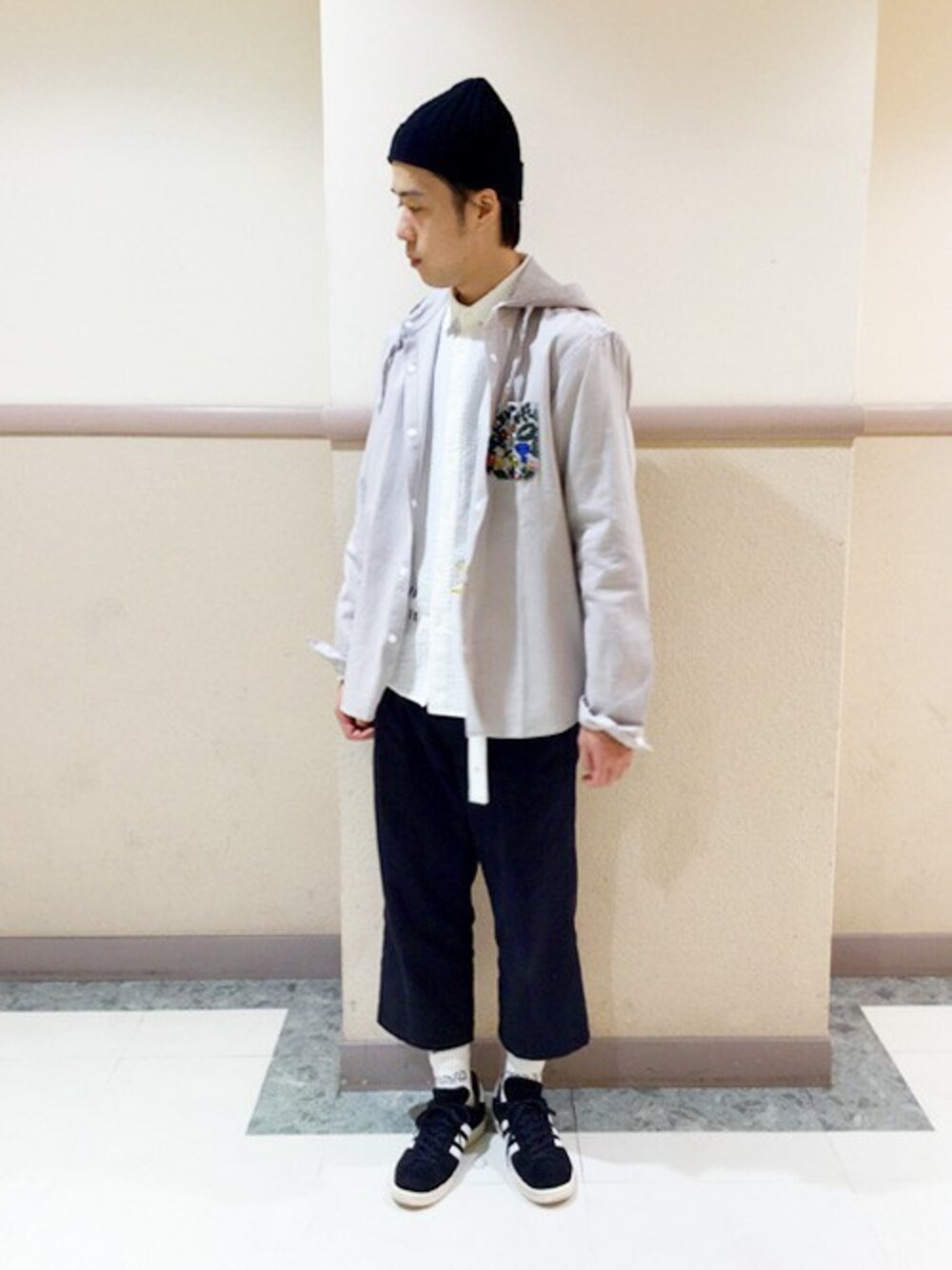 インナーのシャツはシアサッカー生地にロゴマークの刺繍がポイント。 綿はもちろんですが、ナイロン等の異素材の羽織がオススメです。 羽織りはお気に入りのオーバーサイズのフードシャツで。