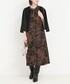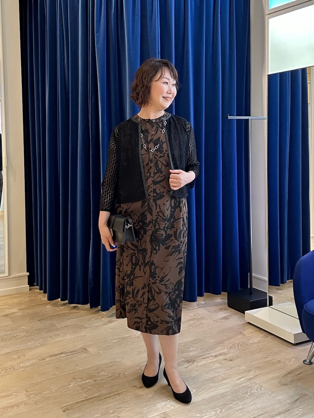 秋色ブラウン✖️ブラックのフラワープリントワンピースに、繊細なレースカーディガンを羽織った華やかスタイル。 ワンピースはライトツイル素材で程よいハリと落ち感があり、すっきりとしたシルエットを演出。サイドベルトで自然にウエストマークされ、スタイルアップ効果も抜群です。 カーディガンはシャイニーラッセルレースの透け感とラメパイピングが上品なアクセントに。前を閉じても開けてもきれいに決まる2WAY仕様で、幅広いシーンに活躍します。 お呼ばれからちょっとしたお出かけまで、特別感をプラスできる大人の上品秋色コーデです。