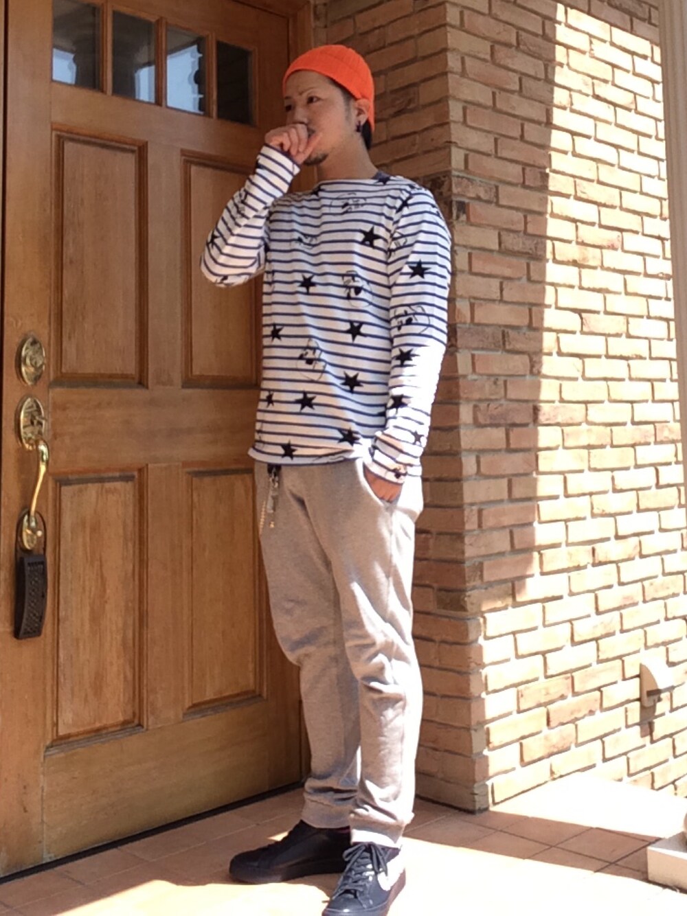 オクシンのTシャツ/カットソー「OVER PRINT BORDER BOAT NECK CUT SEWN」を使ったコーディネート