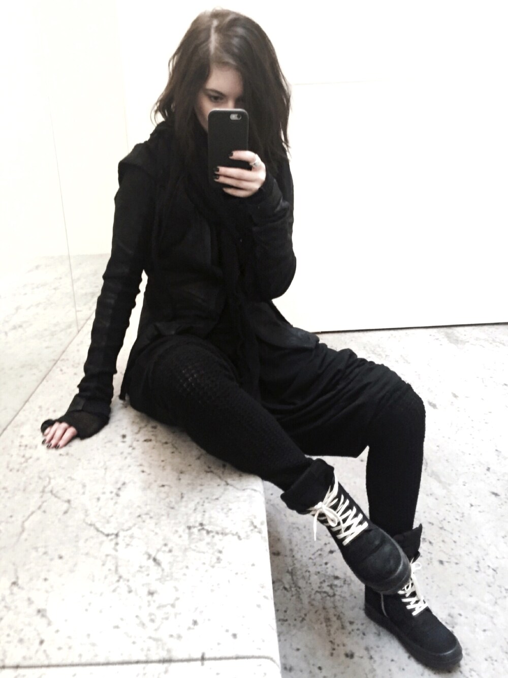 early Rick Owens leather jacket, Junya Watanabe wool drop crotch trousers, Rick Owens geobaskets.