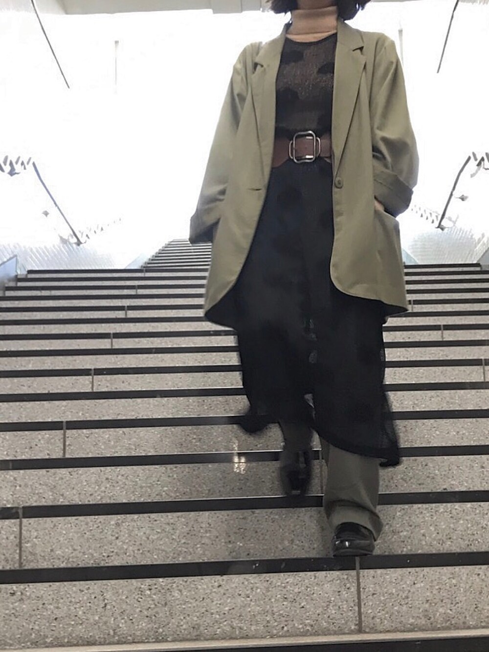 透け感あるワンピースをいれつつも、ベルトやジャケットで辛さを。