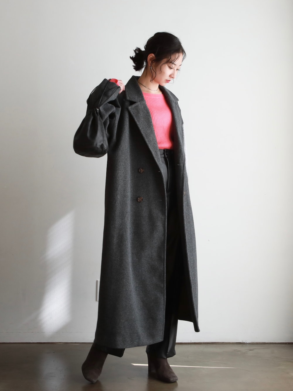 チャコールグレーのチェスターコートはカラーアイテムと相性抜群○