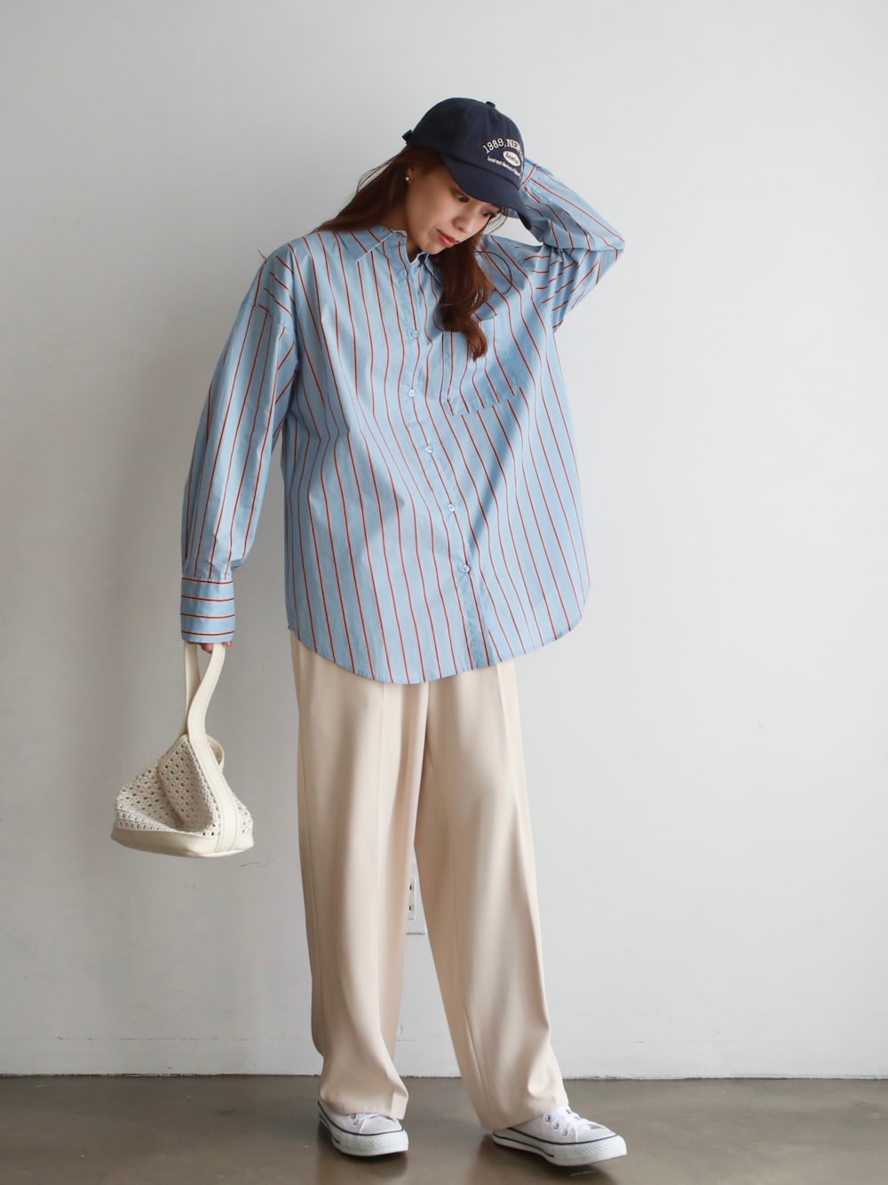 赤×ブルーの配色が可愛いストライプシャツにスラックスでゆるっと大人カジュアルコーデ🧢 ご覧頂きありがとうございます☺︎ -feepur WEAR- マネしやすいオシャレコーデを毎日投稿してるので是非followお願いします✴︎