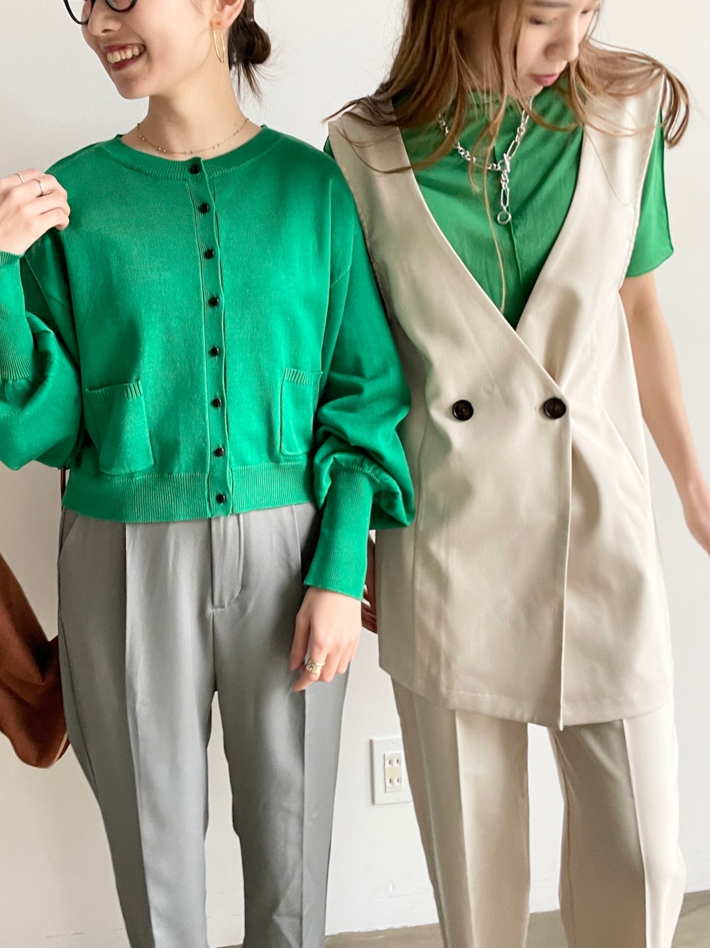 トレンドのビビッドなグリーンのリンクコーデ🥝🥬🥦 グレーやアイボリーで合わせるとコーデにも取り入れやすくて◎ ジレとパンツのセットアップは特別価格で🉐 ご覧頂きありがとうございます☺︎ -feepur WEAR- マネしやすいオシャレコーデを毎日投稿してるので是非followお願いします✴︎