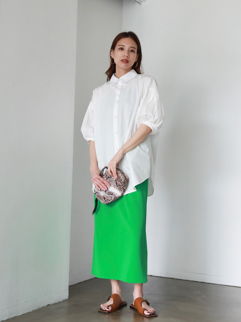 白シャツにカラースカートのシンプルコーデに見せかけ、実はザックリと開いたバックデザインがポイント✴︎ ご覧頂きありがとうございます☺︎ -feepur WEAR- マネしやすいオシャレコーデを毎日投稿してるので是非followお願いします✴︎