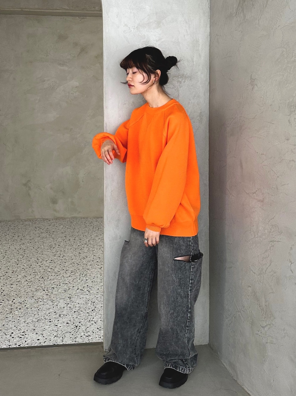 冬のオレンジコーデ🍊 ビビッドなオレンジにブラックデニムが相性バツグン✨