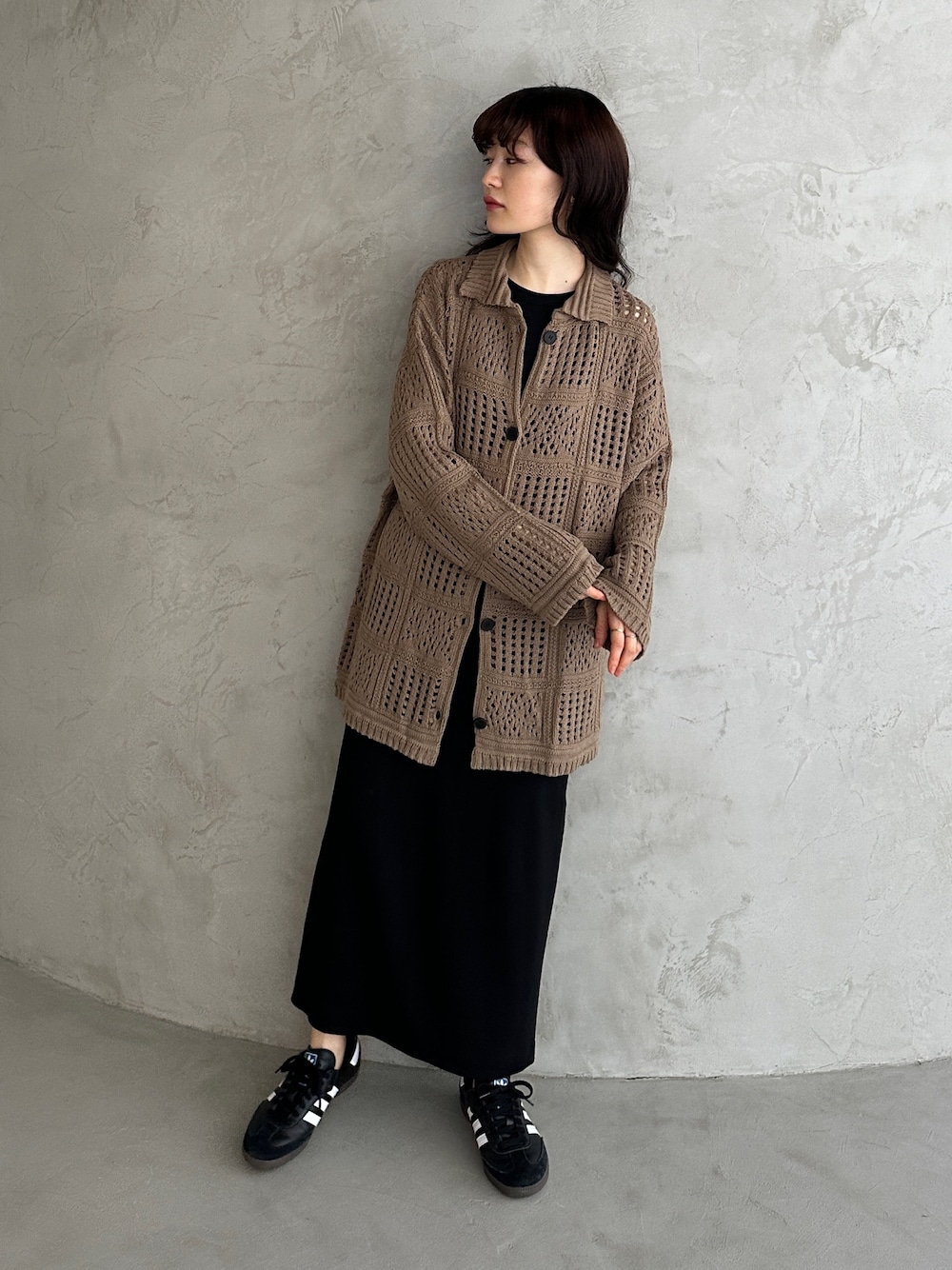 クロシェ編みの大人っぽいシャツ風ニット🪹 ミドル丈なのでどんなボトムでも相性抜群です✴︎