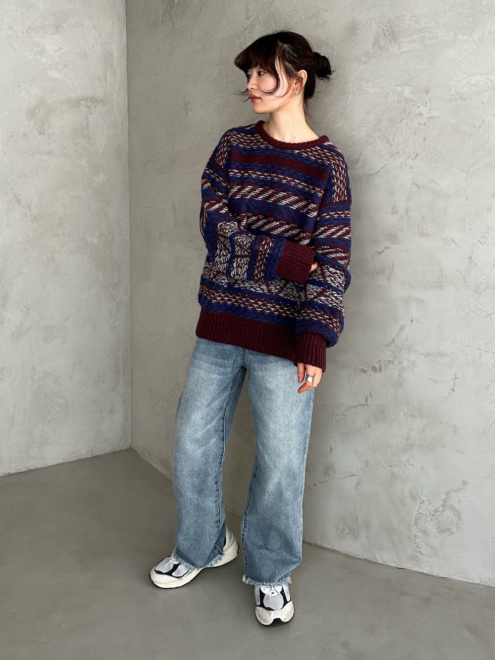 シックな柄ニットにデニムを合わせた、カジュアルコーデ🧯