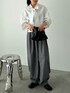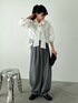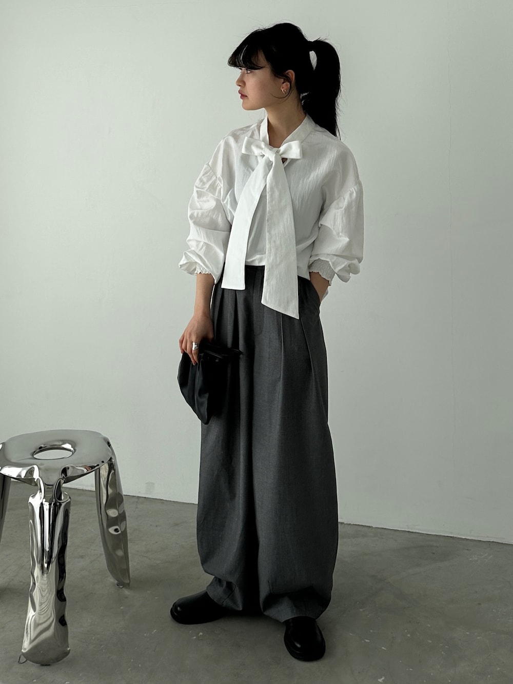 存在感のあるホワイトのボウタイブラウスにはグレーのスラックスで大人カジュアルに🫏