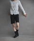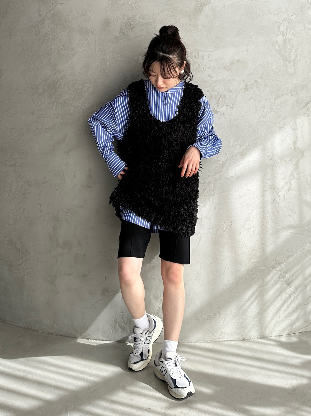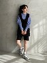 フェザーの存在感が抜群のブラックベスト🐕🦺 ブルーのストライプシャツにショートパンツ合わせでハンサムに着こなして✴︎