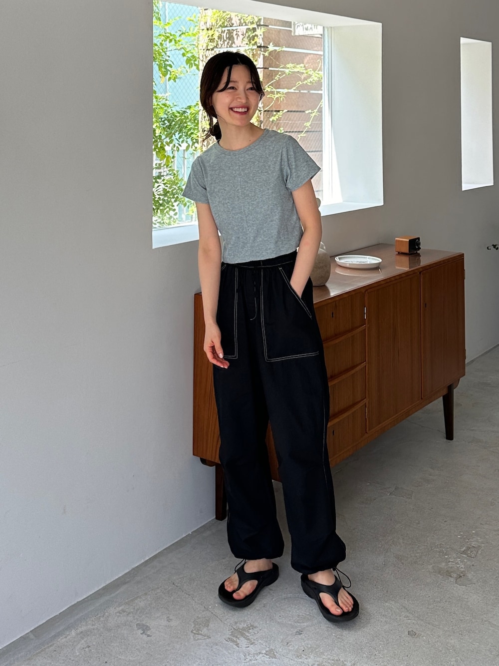淡いカラーのトップスにはブラック合わせで引き締めるのがポイント📧