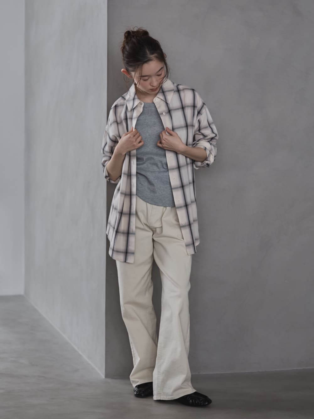 オーバーサイズのチェックシャツをさらっと羽織って、抜け感のあるスタイルに👀 グレー×アイボリーでやわらかくまとめて、ナチュラルな印象に。 頑張りすぎないラフさが今の気分。