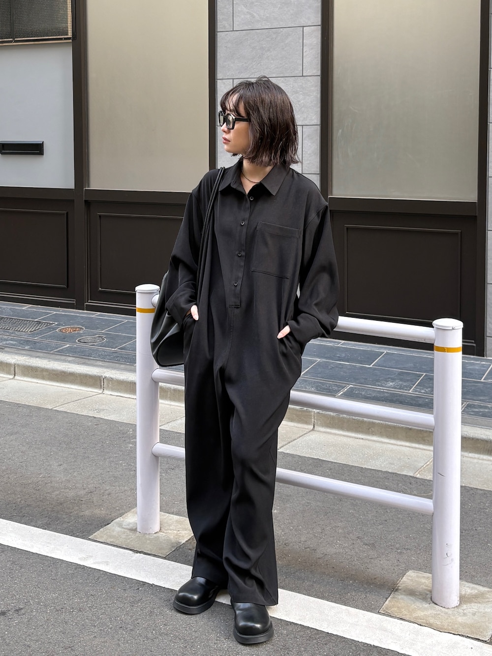 ブラックのジャンプスーツはサラッとした素材感がカジュアルになりすぎないのが◎ 小物もブラックで統一させて大人なオールブラックコーデ🐦⬛