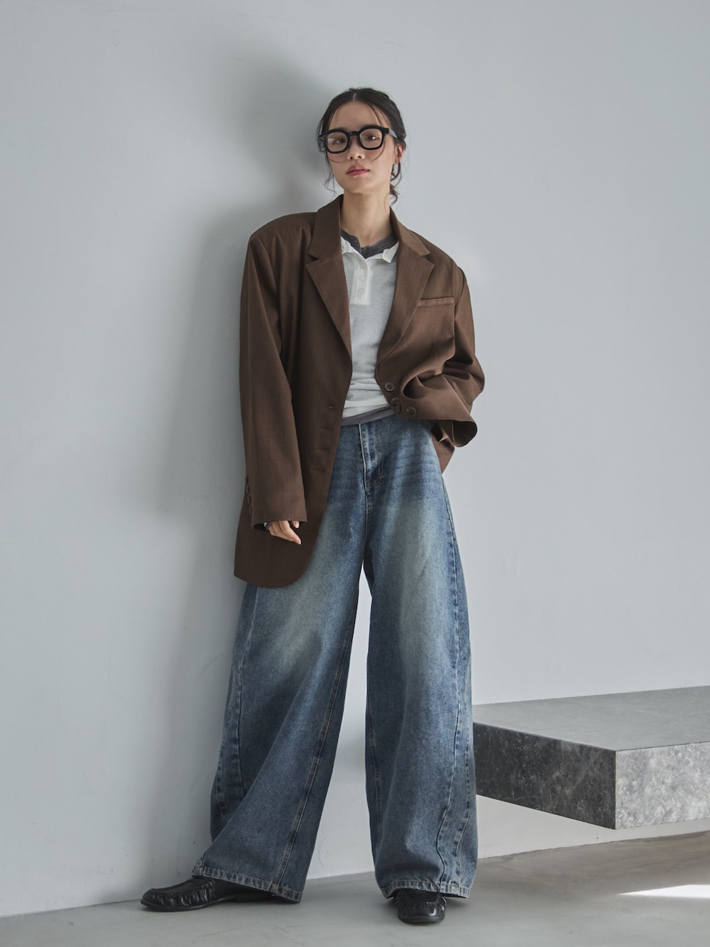 ジャケット×デニムの定番コーデは、オーバーサイズのジャケットにバレルレッグのデニムと旬要素をプラスしてトレンドライクに🪐