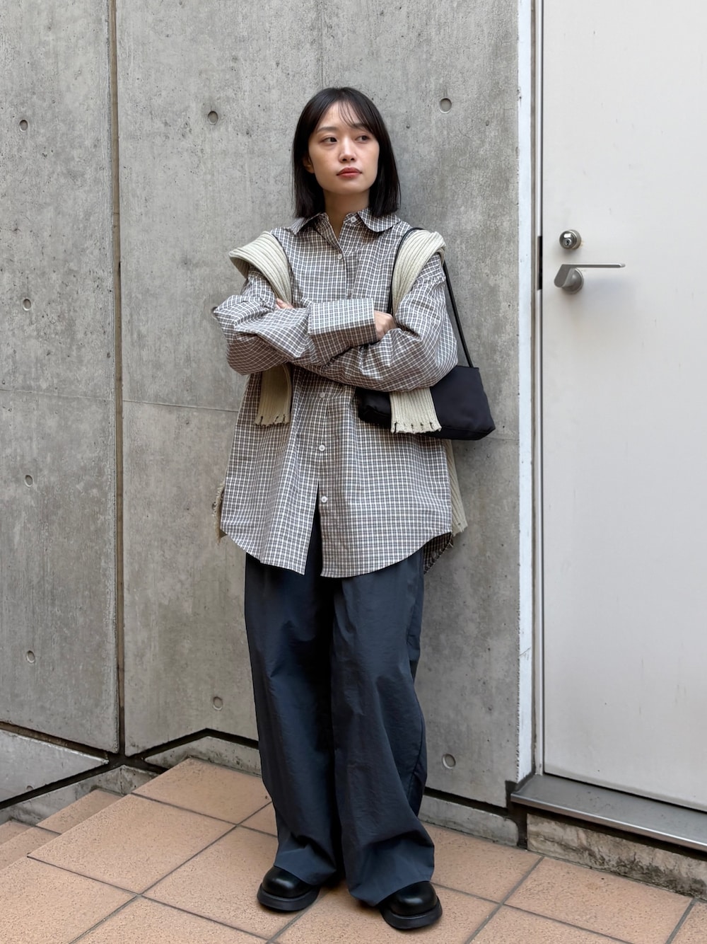 オーバーなチェックシャツにナイロンのスラックスでハンサムなスタイルに🕶️ ミニバッグでレディ要素をちょこっとプラスがポイント🪐