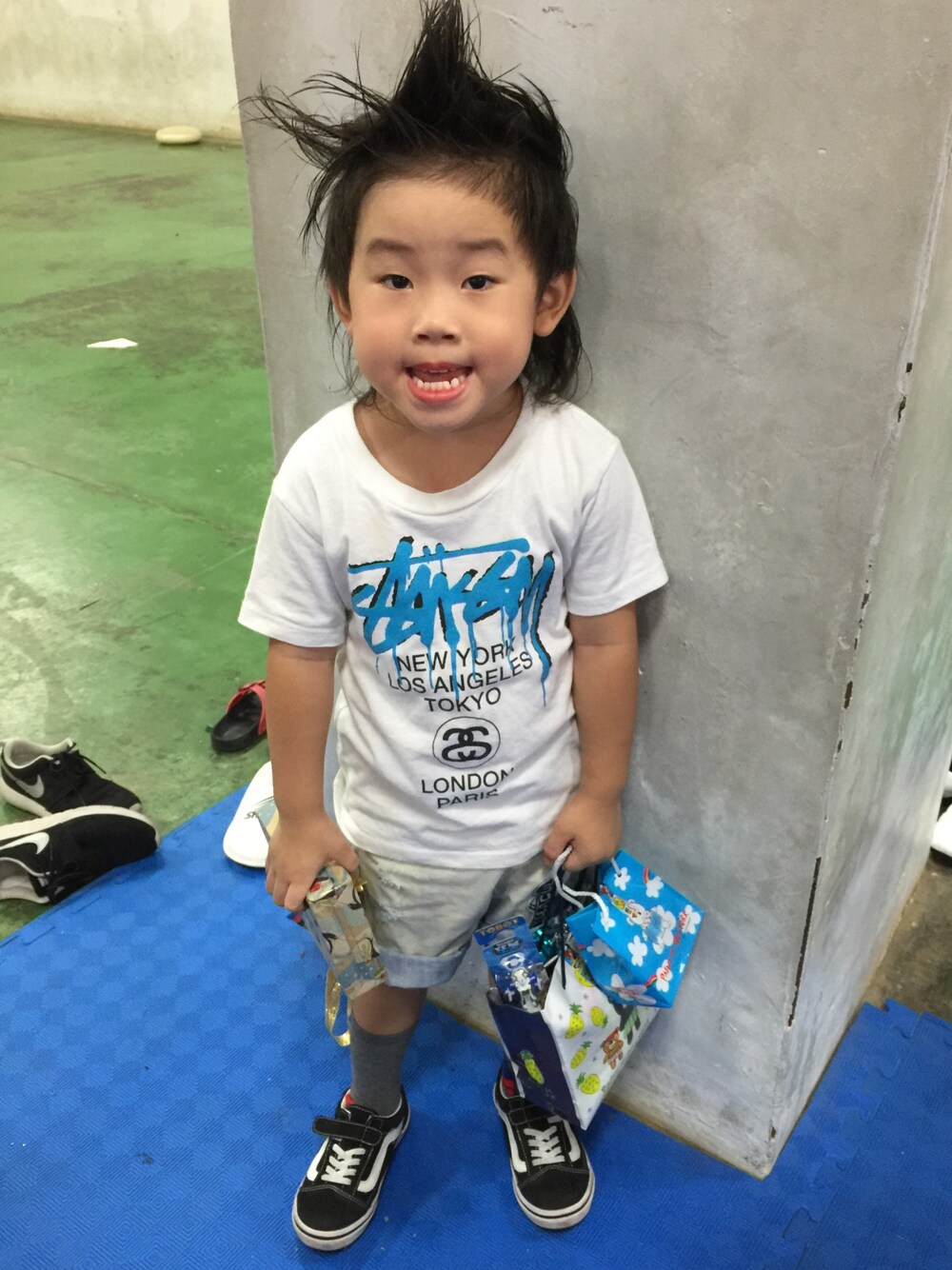 ホワイト系のTシャツ/カットソー、ブルー系のデニムパンツ、ブラック系のシューズを着用したキッズの秋コーディネートの1枚目の写真