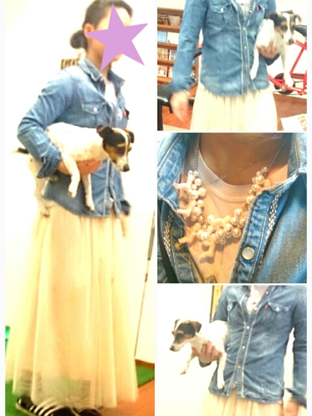 tops: リーバイス skirt: ネット通販 shoes: 100均スリッパ accessory: 自作 dog: ジャックラッセルテリア♀ この毛皮のdogはじっとしているのが苦手な模様。 ネックレスは珊瑚かと思いきや赤ちゃん!