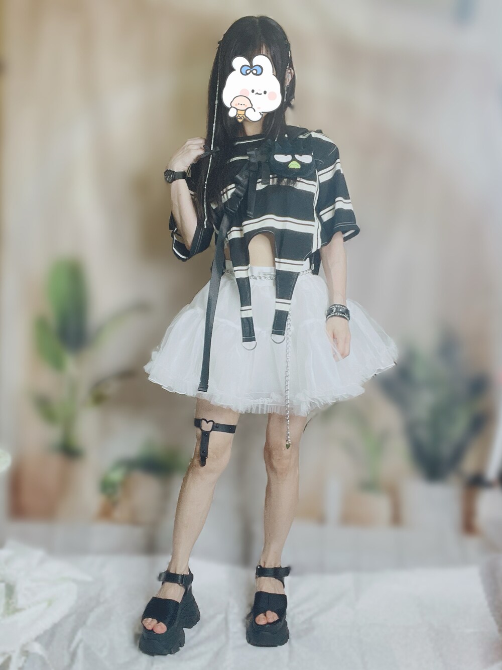 黒髪だからかな……? やっぱり白のみより、写真で見ると黒が多い方が合う気がします🤔 写真で撮らないと分からないものですね💦 真っ白も好きだけど♡ 何気にポイントでシルバーをあちこち散りばめてます🙌 ずっと組み合わせたかった、jouetieのガーターTシャツ+ボリュームチュールスカート💓 組み合わせてみても、やっぱり可愛いです♡ バックにつけた、バツ丸くんの存在感でかい😂
