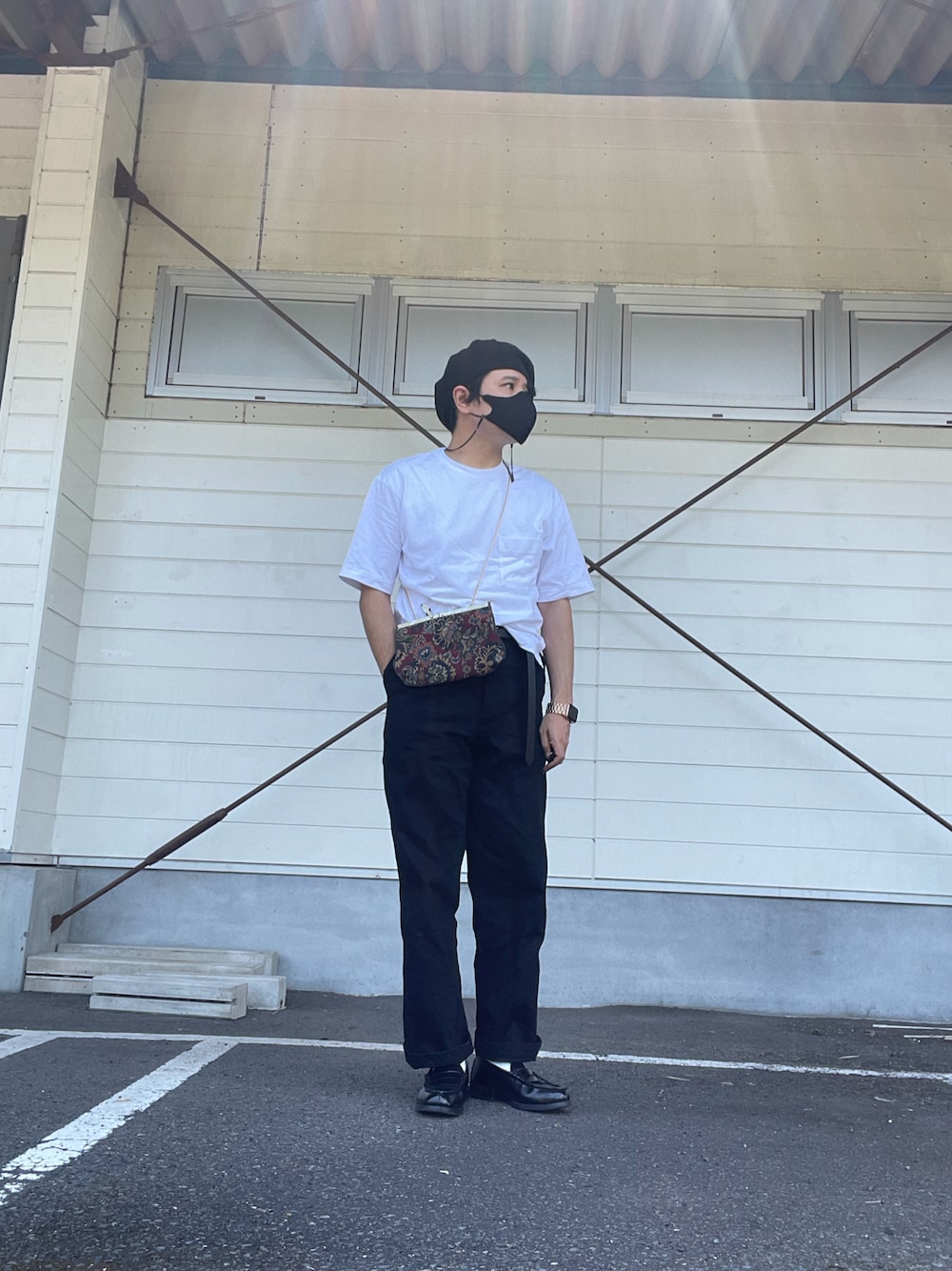 COMOLIのデニムが最高なので。 モノトーンコーデにベレー帽と肩掛けのショルダーバッグで一工夫してます。 ゴールドチェーンとアップルウォッチのバンドを合わせてます。 白の靴下もチラ見せしてます。 夏は白シャツをかなり着そうです。