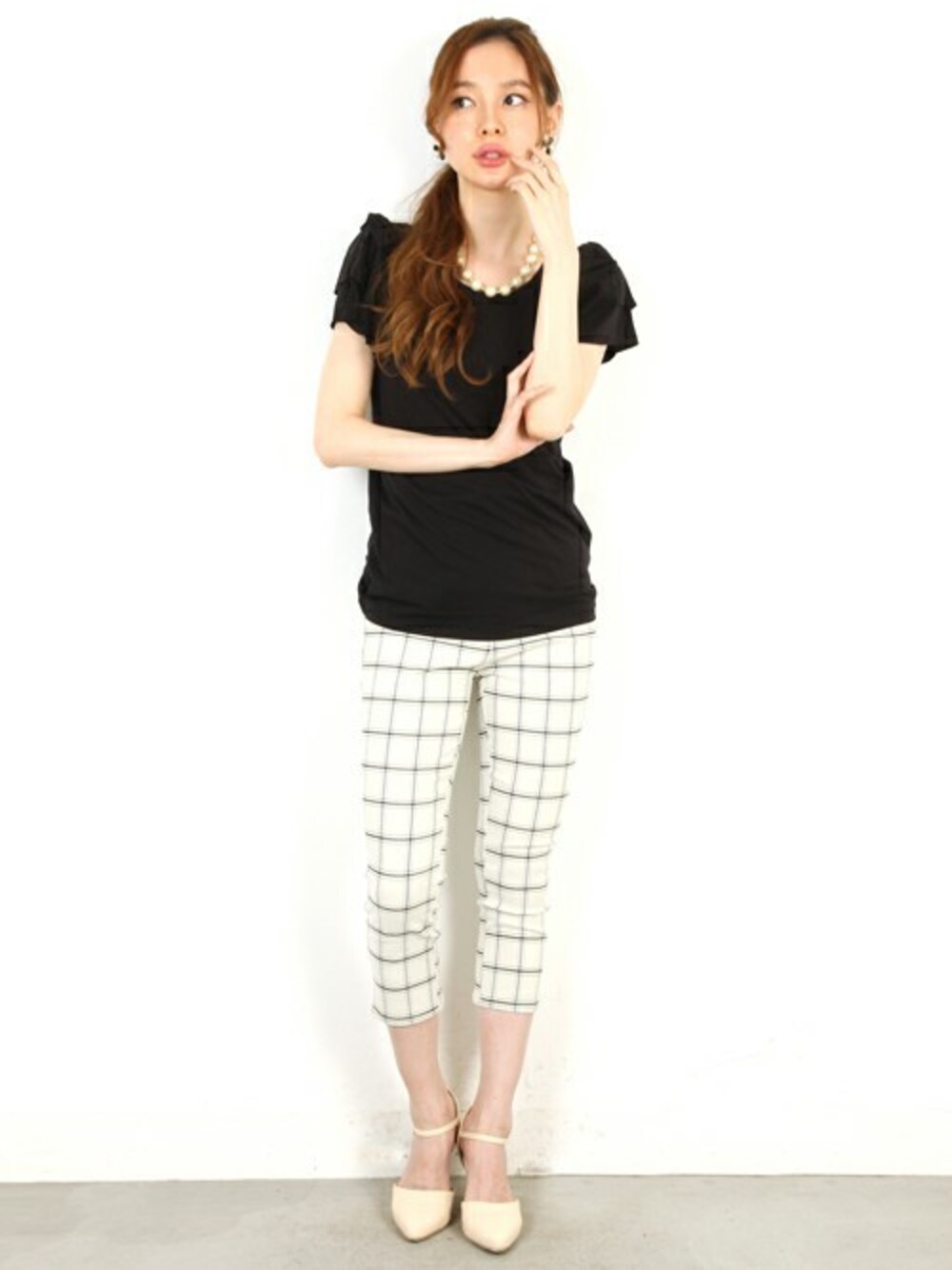 袖のフリルが女性らしいカットソー。ふんわり程よいボリュームが腕を華奢に見せてくれます。 合わせたチェックのパンツはストレッチ抜群のとにかく伸びる柄パンツ。極上のはき心地が好評です! モノトーンでまとめたシックな大人コーデ。フリルでさりげないフェミニンポイントを取り入れました♪