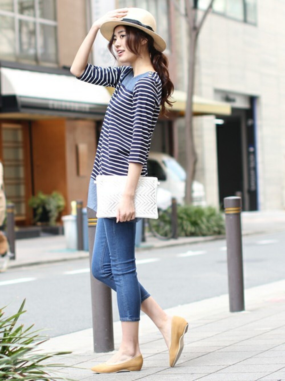 ナチュラルさを感じる肩のウッドボタンがアクセントになるチュニックは、ヨーク切替デザインで顔周りをスッキリとした印象に。カジュアルなボーダーアイテムを大人っぽく着ることが出来ます!アンクル丈のデニムで抜け感を出したスタイリングがオススメ◎