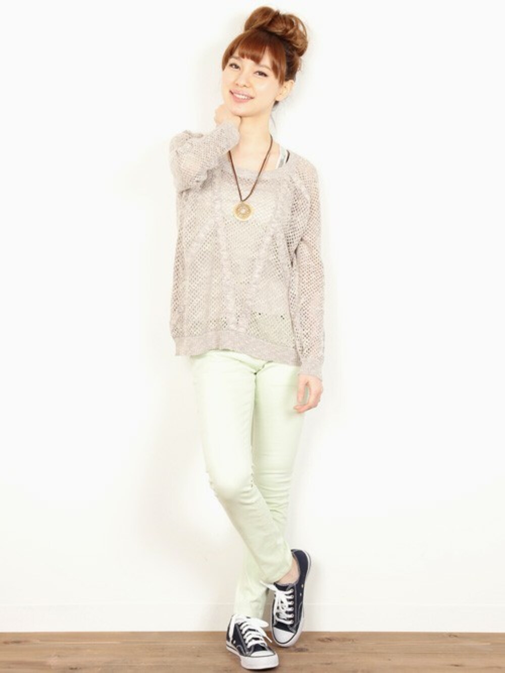 透け感のあるざっくりスラブニットでオンナらしいヌケ感をプラス♪パステルカラーのスキニーと合わせた柔らかい雰囲気の大人カジュアルスタイル!