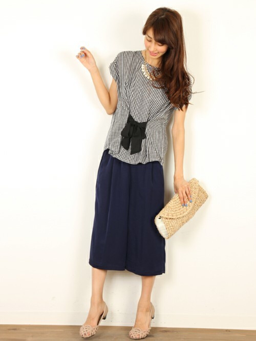 フェミニンとカジュアルのイイトコ取りができるワンランク上のギンガムチェック!ウエストのリボンが甘めで可愛い♪ゆったりとした身幅ですが全体的にコンパクトに見えるシルエットは女性らしくフェミニンな印象に。 ゆるてろ素材のガウチョパンツが涼しげ!