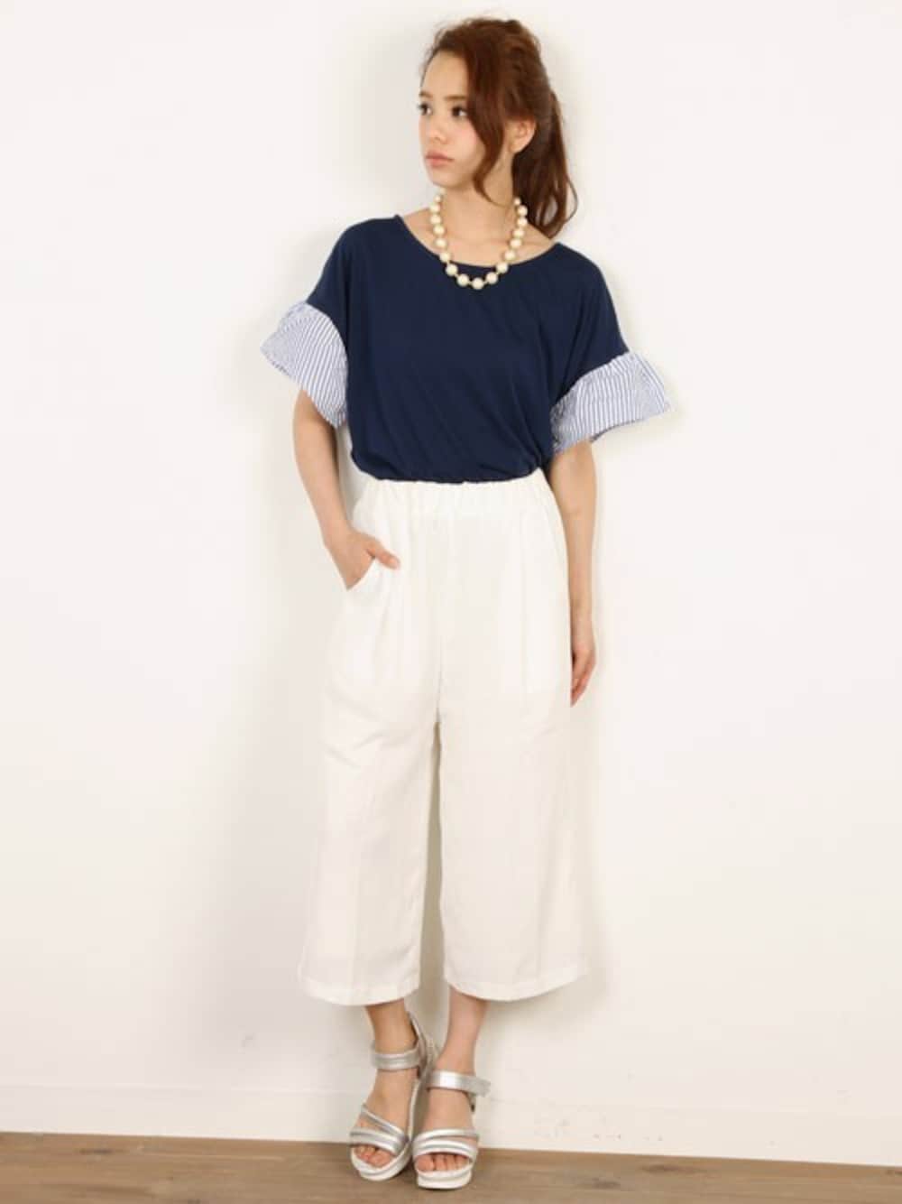 袖のちょこっとした存在感が大人可愛い袖ストライプ切替プルオーバー。シンプルをベースに清涼感のあるストライイプのふわっとした袖が愛らしくレディーなデザインの切替プルオーバーです。