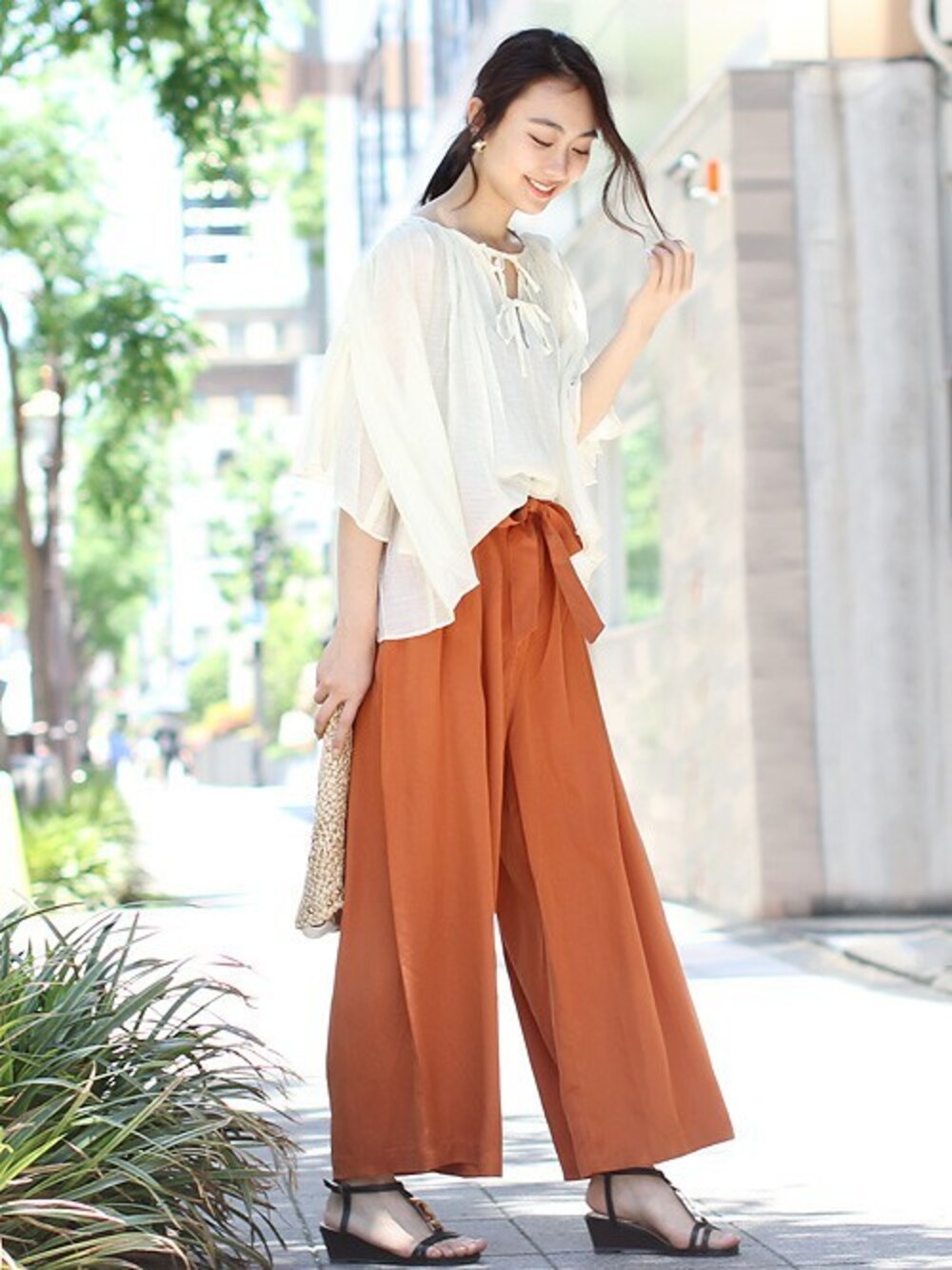 リヨセル100%のとろみ素材のワイドパンツは女性らしくキレイめなアイテムと相性抜群。甘めのシフォンブラウスと合わせてキレイめカジュアルなスタイリング!