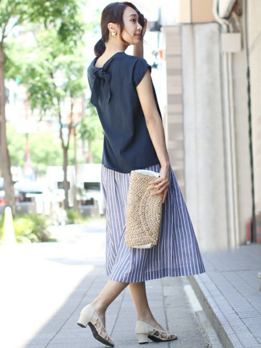 バックスタイルをリボンでほんのり甘くするブラウス。ナチュラルな生地感と大きすぎないリボンは甘さ控えめで大人可愛いスタイリングに。ストライプのスカートが爽やかさをプラスします。