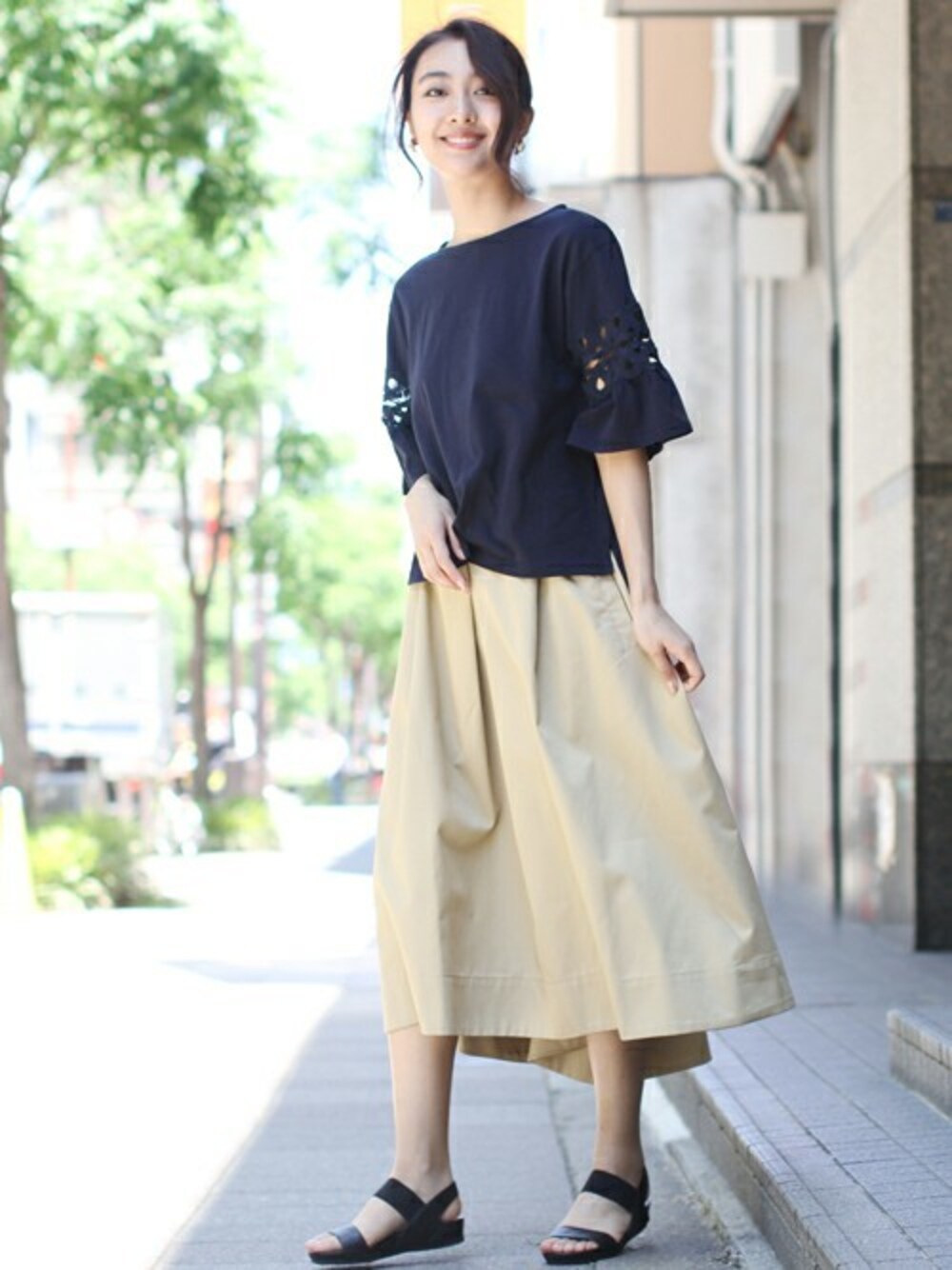 レース越しの肌見せが大人フェミニン!立体的なケミカルレースは甘くなり過ぎないデザインで、カジュアルにもキレイめにもマッチ◎