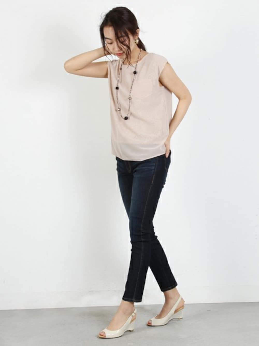 シフォンブラウスとレースブラウスの2タイプが楽しめるリバーシブルな1枚。カジュアルなデニム合わせでも上品な大人の女性らしさを演出してくれます。