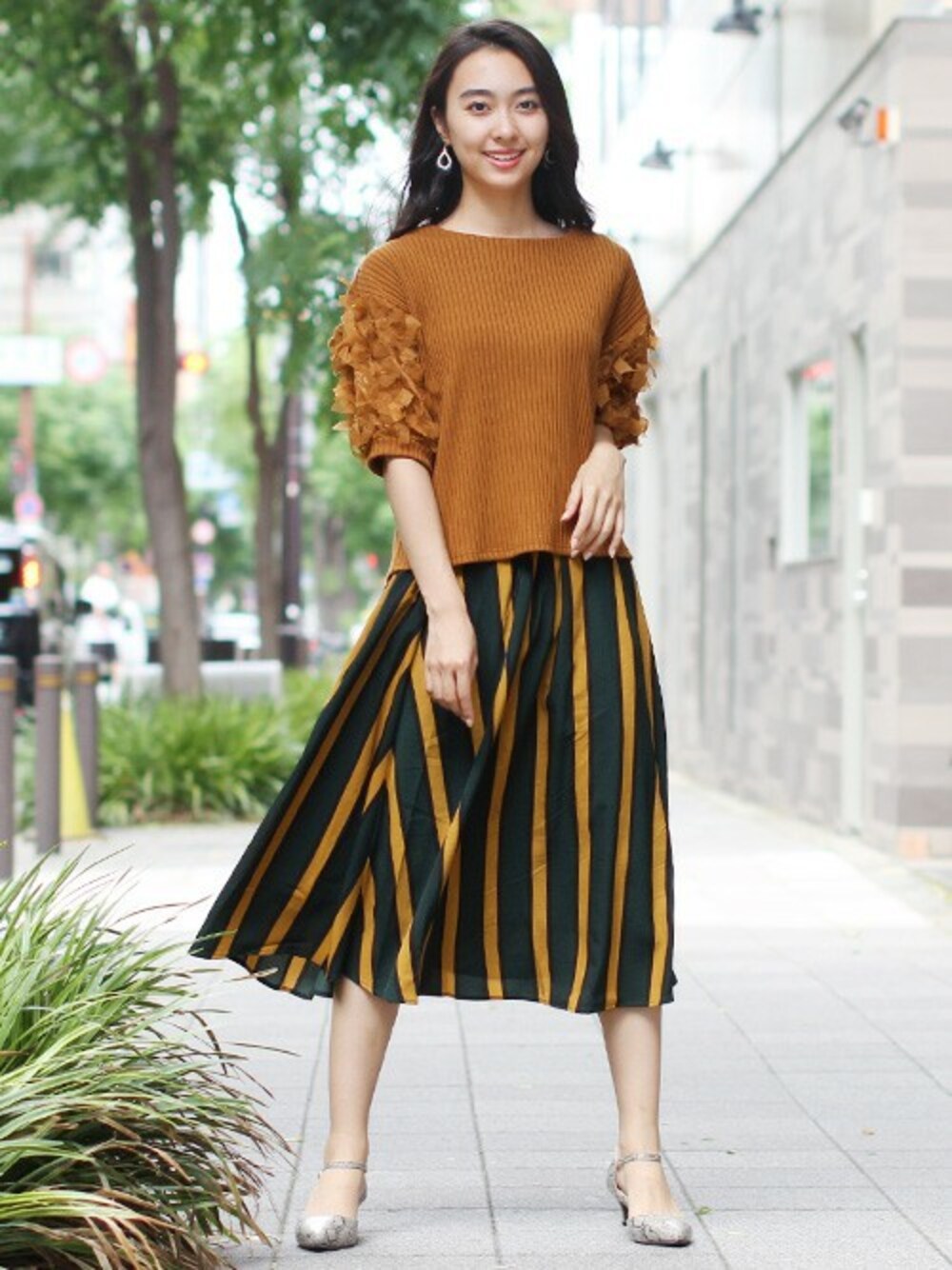 袖デザインがフェミニンなリブT。配色のストライプ柄のスカートが存在感抜群!秋気分高まるカラーリングのコーデです。