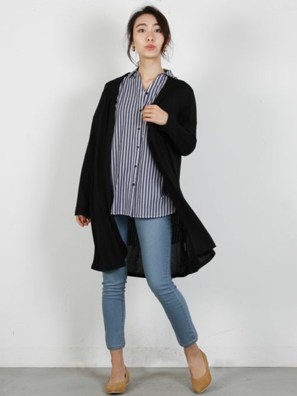 パリッとはりのあるストライプシャツにロングカーデをサッと羽織った大人のデイリーカジュアルスタイル◎ひらりとなびく柔らか素材が羽織りやすいポイント。