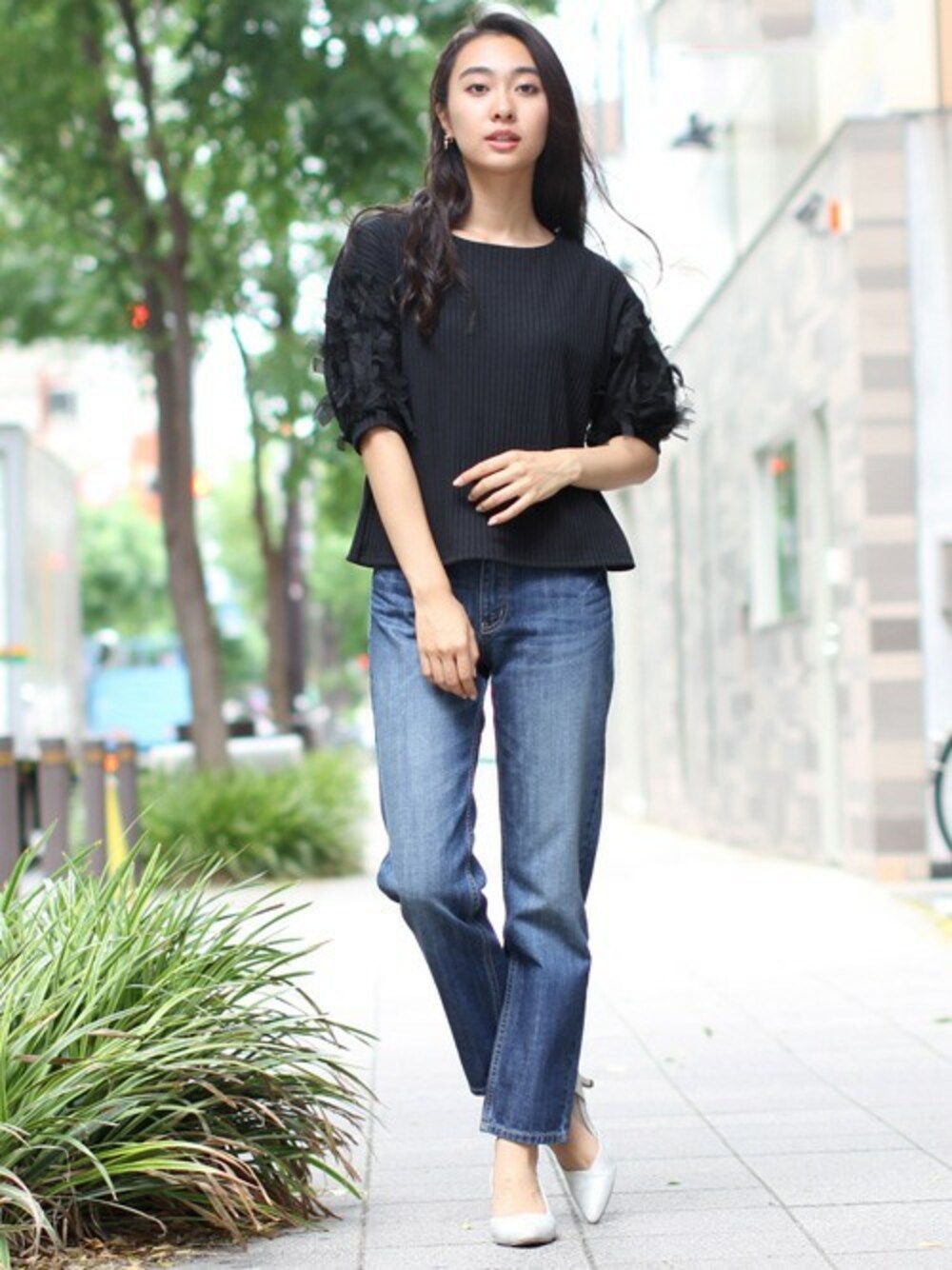繊細なチュールレースが華やかなアクセントになるリブトップスはシンプルにデニムとコーディネート。 女性らしさとメンズライクなカジュアルさがMIXされてこなれ感たっぷり!