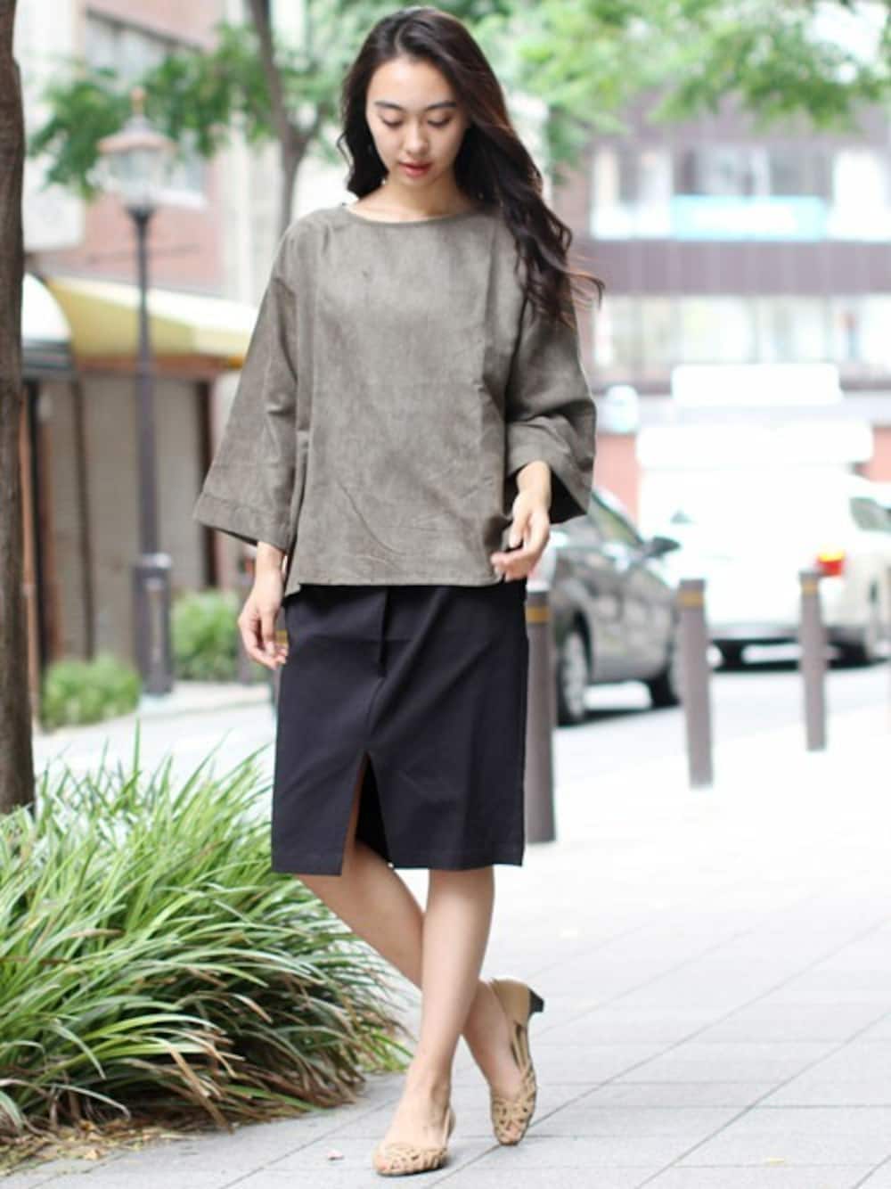 シーズンムード漂うフェイクスエードのプルオーバー。 ワイドな袖幅と肩の落ちたドロップショルダーがゆるくてラフな印象を与えます。 タイトスカートはストレッチ抜群ののびのび素材。窮屈感が苦手な方にもオススメのアイテムです。