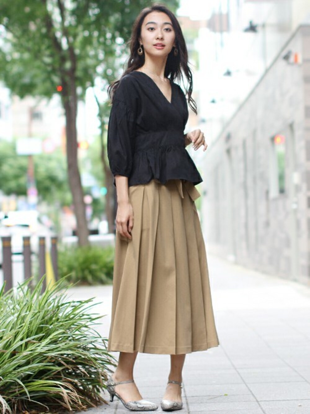 キュッとくびれたウエストから、フレアに広がるペプラムシルエットが大人かわいいブラウス。大人顔な太めプリーツスカートで落ち着いたトーンのスタイリングです。