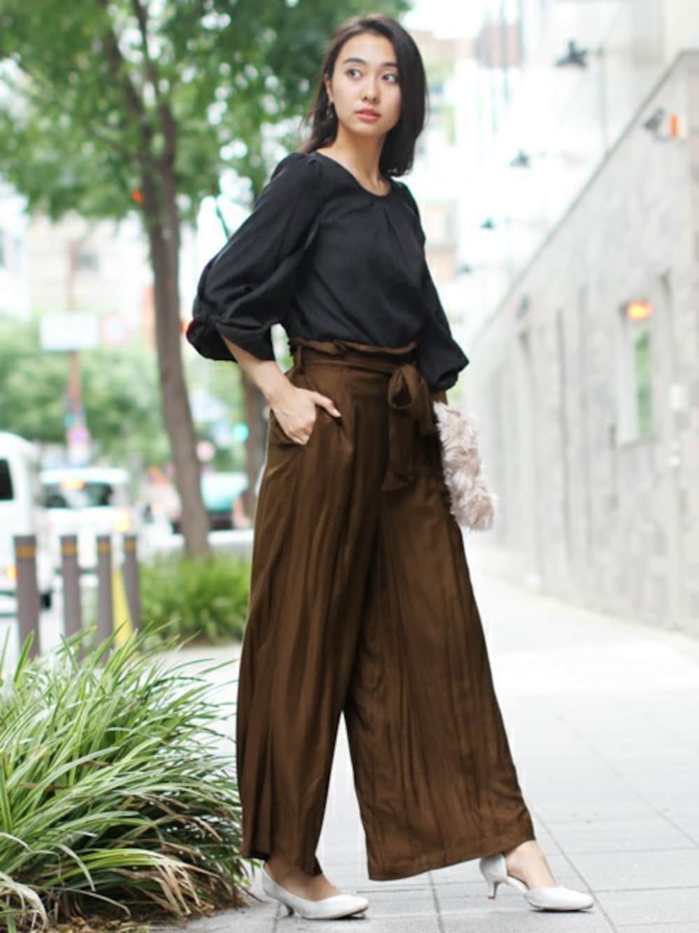 ボリューミーなリボンモチーフの袖が愛らしいピーチスキンのプルオーバーブラウス。カーキのワイドパンツでちょっぴりクールでカッコいい大人カジュアルです。