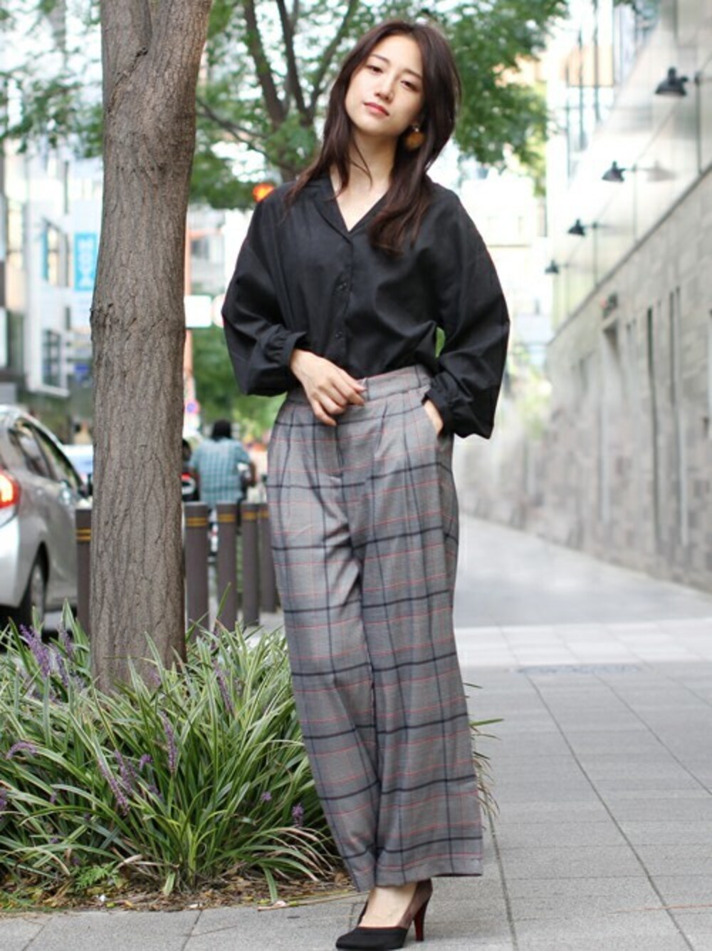 秋を感じるピーチスキン素材のオープンカラーシャツ。チェック柄のワイドパンツでクールにキメた大人スタイル。オフィスコーデにも◎