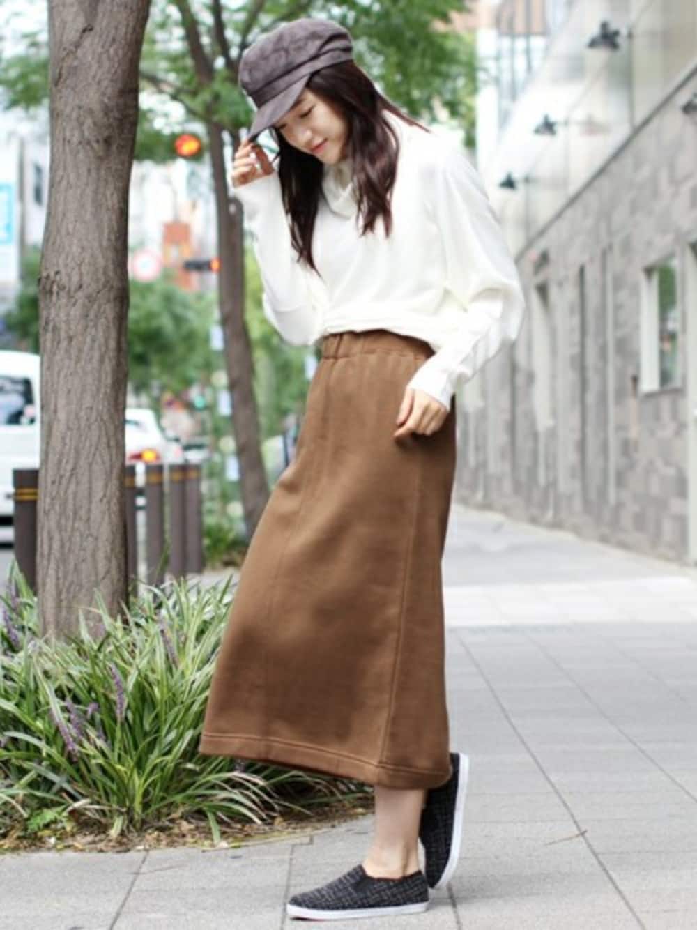 ホワイトのオフタートルニットは、それだけで女性らしくフェミニンになるアイテム! スウェット素材のタイトスカートは、裏起毛タイプ!あったか楽々カジュアルスタイルを叶えます。