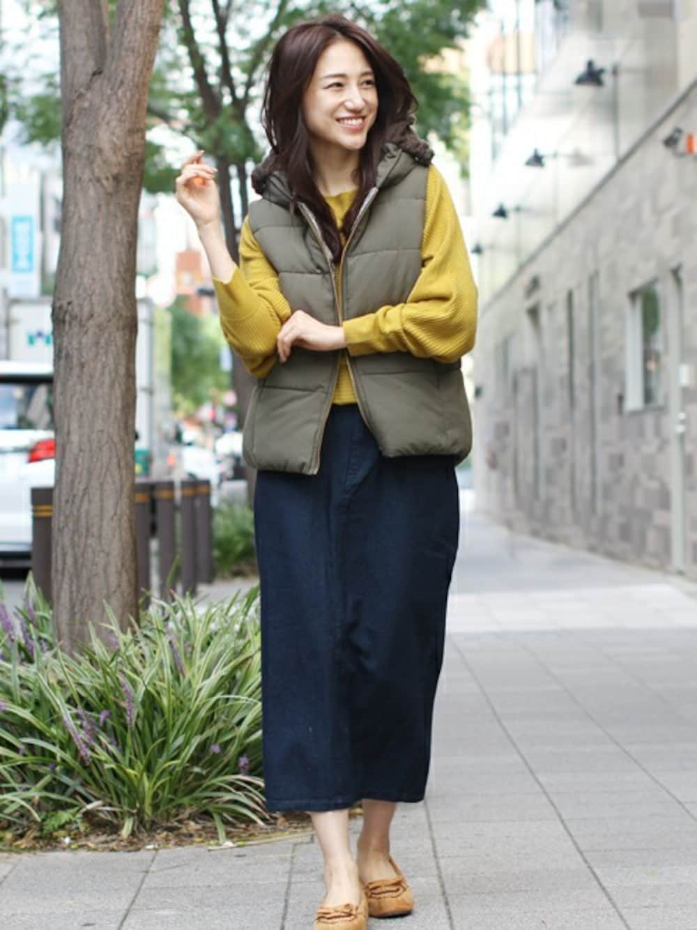 しっとりとした柔らか素材のニットがクセになる横リブのニット♪ ダウンベスト+デニムスカートでとことんカジュアルにコーディネート! 秋冬のアウトドアにもオススメです♪
