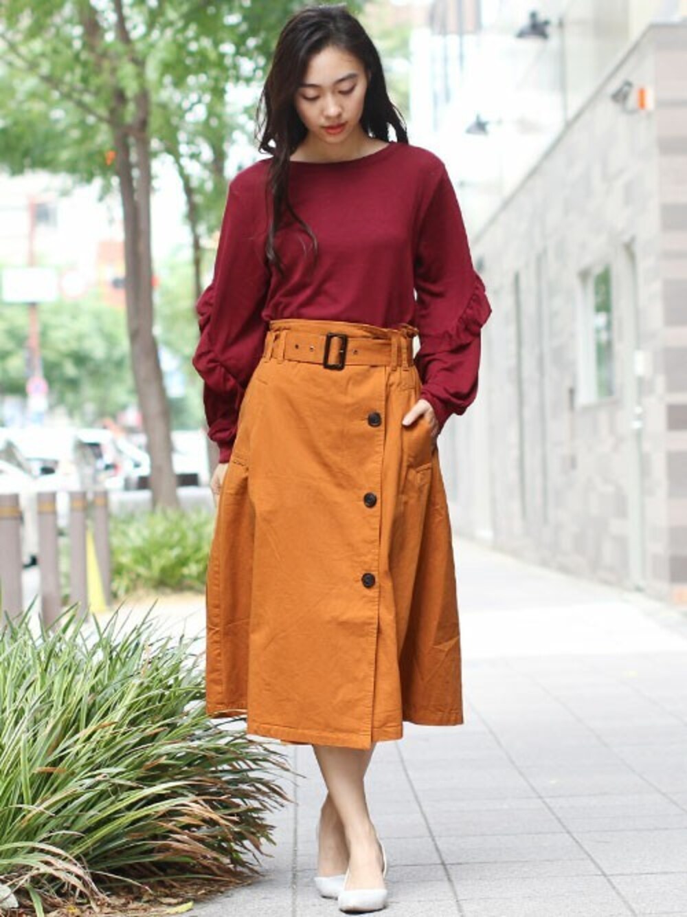 前後どちらでも着用OKな2way仕様です。 今回はフロントフリルを後ろにしてバックデザインで魅せるスタイル!トレンチスカートが愛らしさをプラスします。