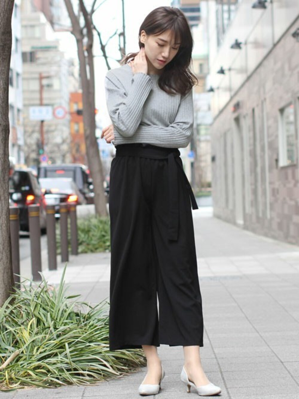 ちょっぴりモードでクールな大人っぽいスタイリング。 ウエストのゴムギャザーでつくるフリルがフェミニンムードをプラスします。