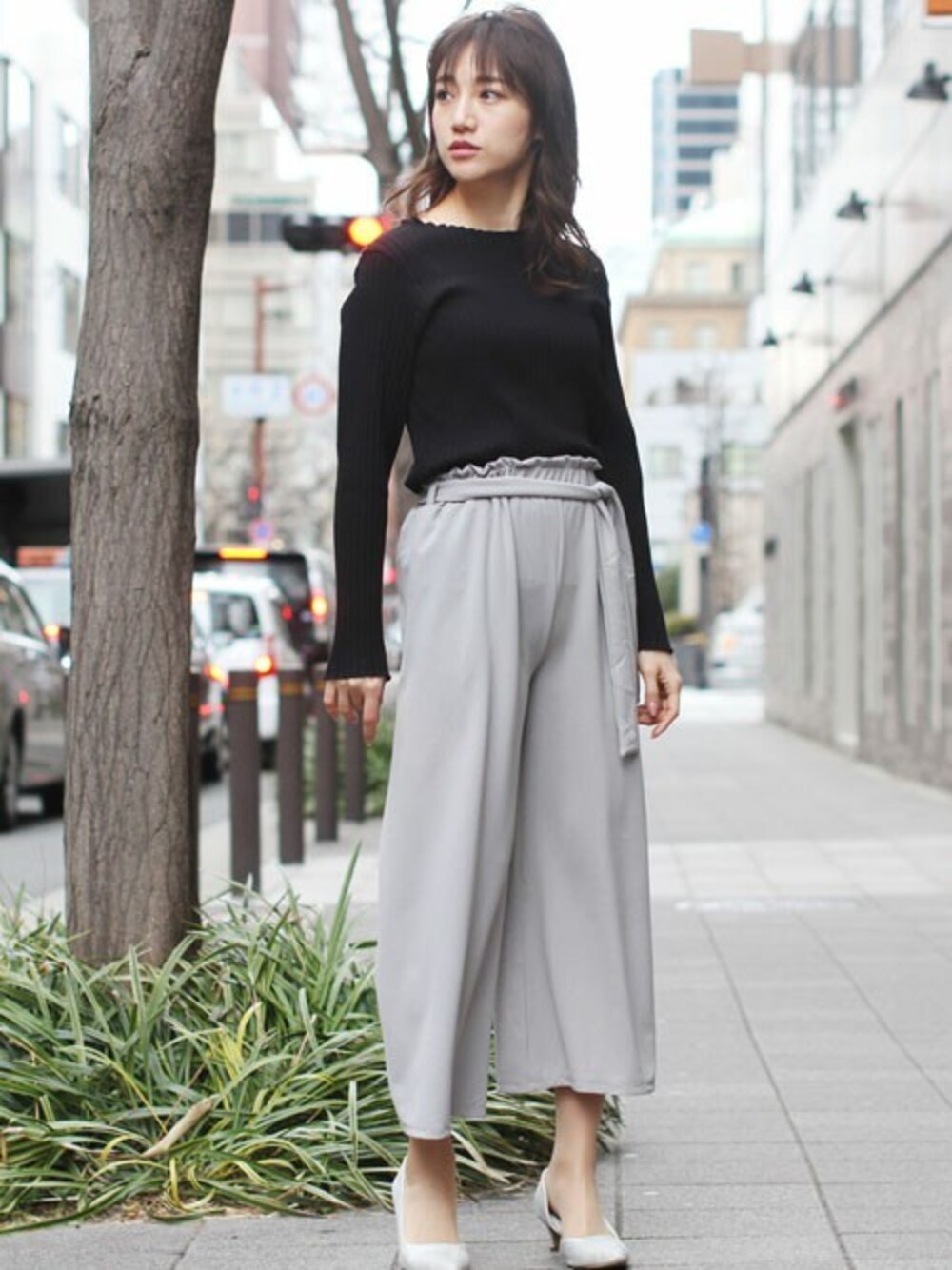 デコボコとした立体リブ編み素材を使用した長袖カットソー。 裾や袖口のメロウ仕立てと、ウエストフリルのパンツが、女性らしくフェミニンをプラスします。