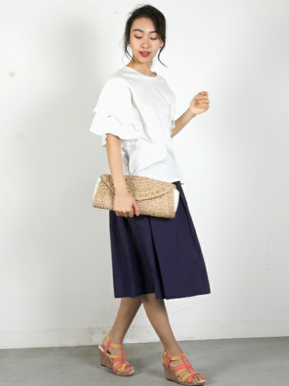 袖のフリルが愛らしいカットソーはさり気なく刺繍を施したフレアスカートでガーリーにまとめました♪